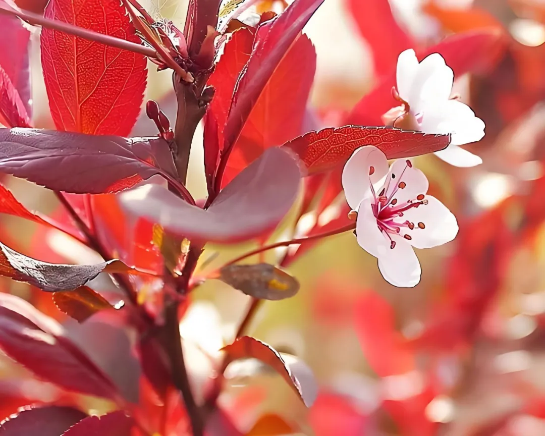 花朵特征:红叶李的花瓣数量通常为五片,形成单瓣的花朵结构,花瓣形状较为规整,边缘平滑或略带锯齿状,花瓣颜色为白色或微带粉色。