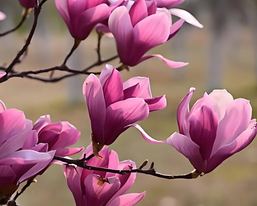 花朵特征:紫玉兰的花蕾呈卵圆形,被淡黄色绢毛包裹,花朵直立于粗壮、被毛的花梗上,形态瓶状,花瓣数量众多,共计9~12片,花瓣外层为紫色或紫红色,内层则带有洁白的色彩。