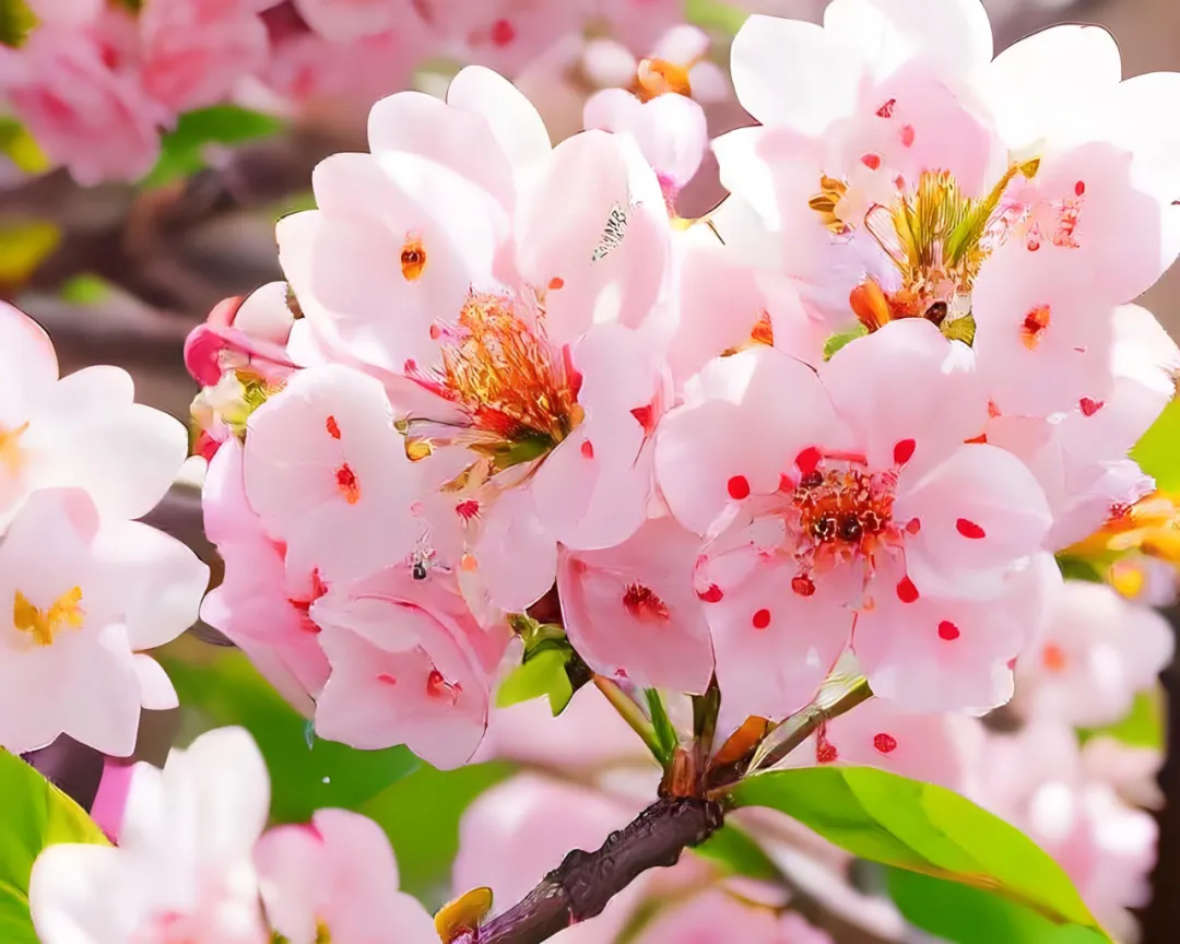 花朵特征:花瓣尖端呈V型缺口,粉白色为主;单瓣五片至重瓣多层,成簇开放;叶子椭圆形带锯齿,叶脉清晰,花瓣易落,开花时满树如云。