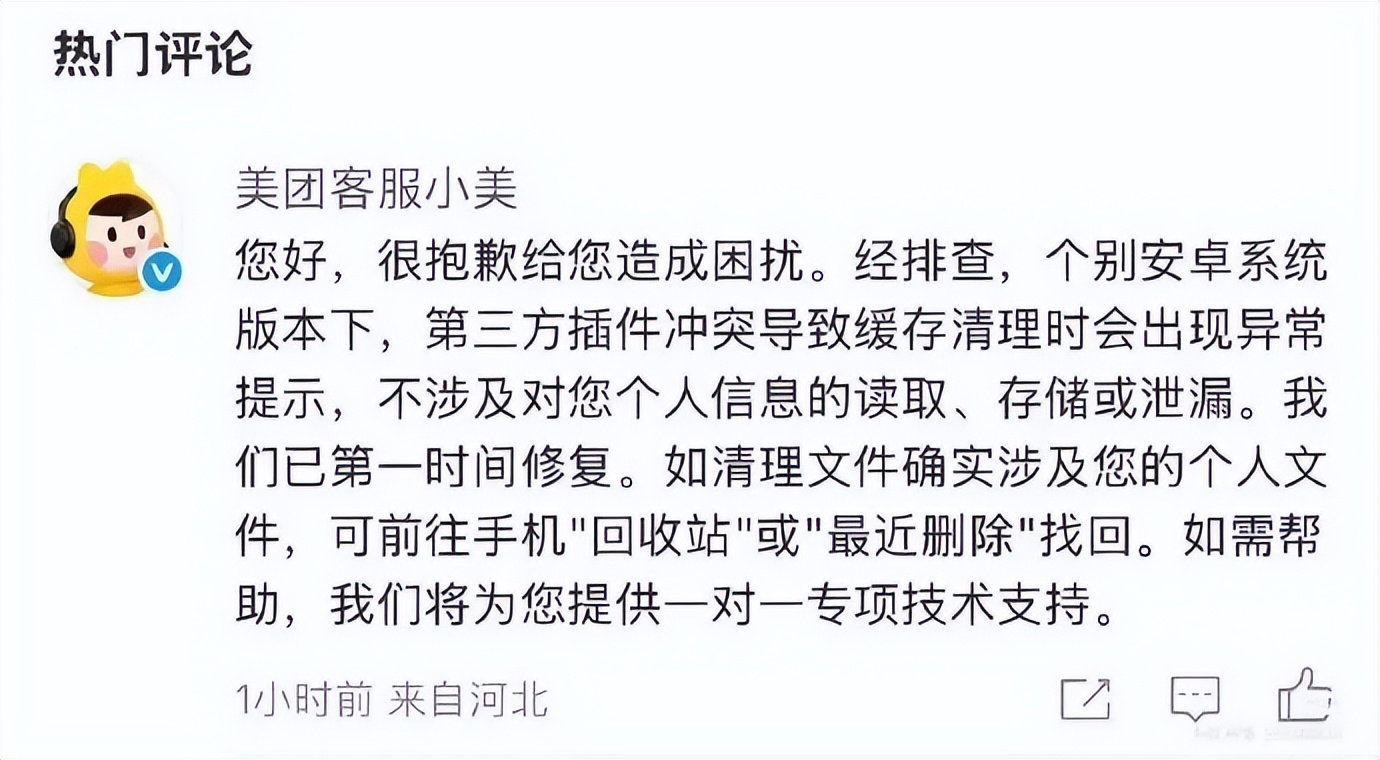 客服小美表示,经过排查,是个别安卓系统版本下,第三方插件冲突导致缓存清理时出现了异常提示,并不涉及对个人信息的读取、存储或泄漏。目前已经紧急修复,还贴心地建议大家去“回收站”或“最近删除”里找找看。