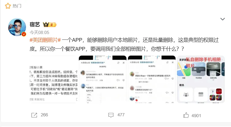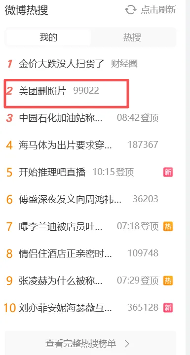 微博热搜榜,“美团删照片”赫然在列,热度爆表。