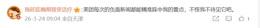 网友“拖延症晚期接受话疗”表示,自己已经被美团伤透了心: