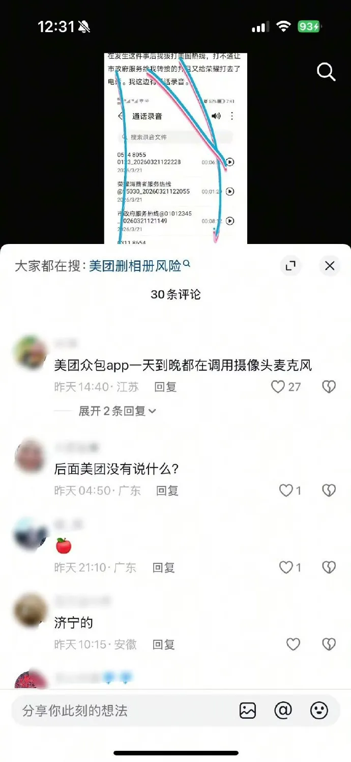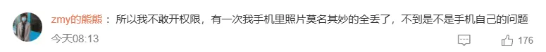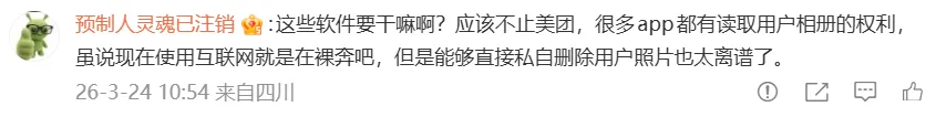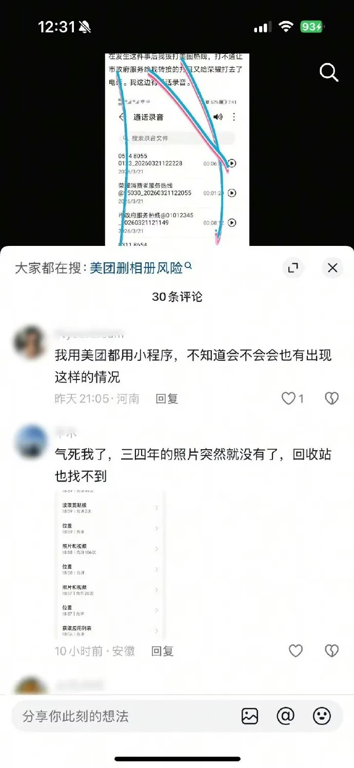 在网友晒出的权限记录里,美团APP在短短几分钟内频繁读取位置、照片和视频,甚至还有剪贴板。评论区里更是哀鸿遍野,有人气愤地表示三四年的照片突然没了,去回收站里找,连个渣都不剩。说好的“异常提示”呢?这明明是物理超度啊!