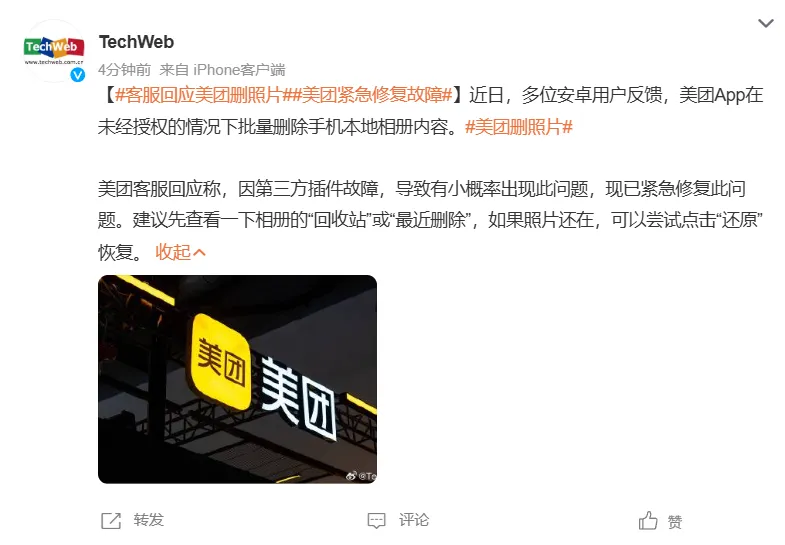 随着受害者越来越多,这事儿终于捂不住了。知名科技媒体TechWeb也下场报道了这起“未经授权批量删除手机本地相册内容”的恶劣事件。