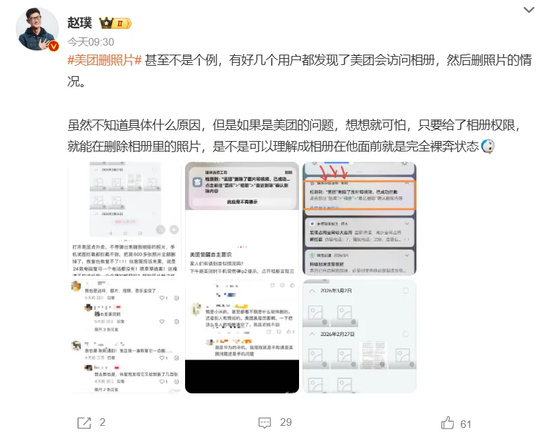大V赵璞晒出手机拦截记录,直呼相册在美团面前是“完全裸奔状态”。