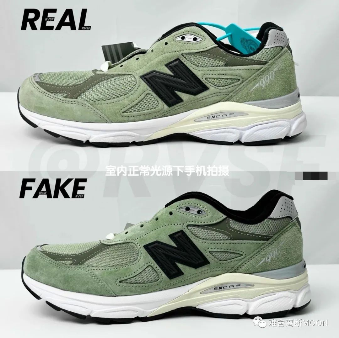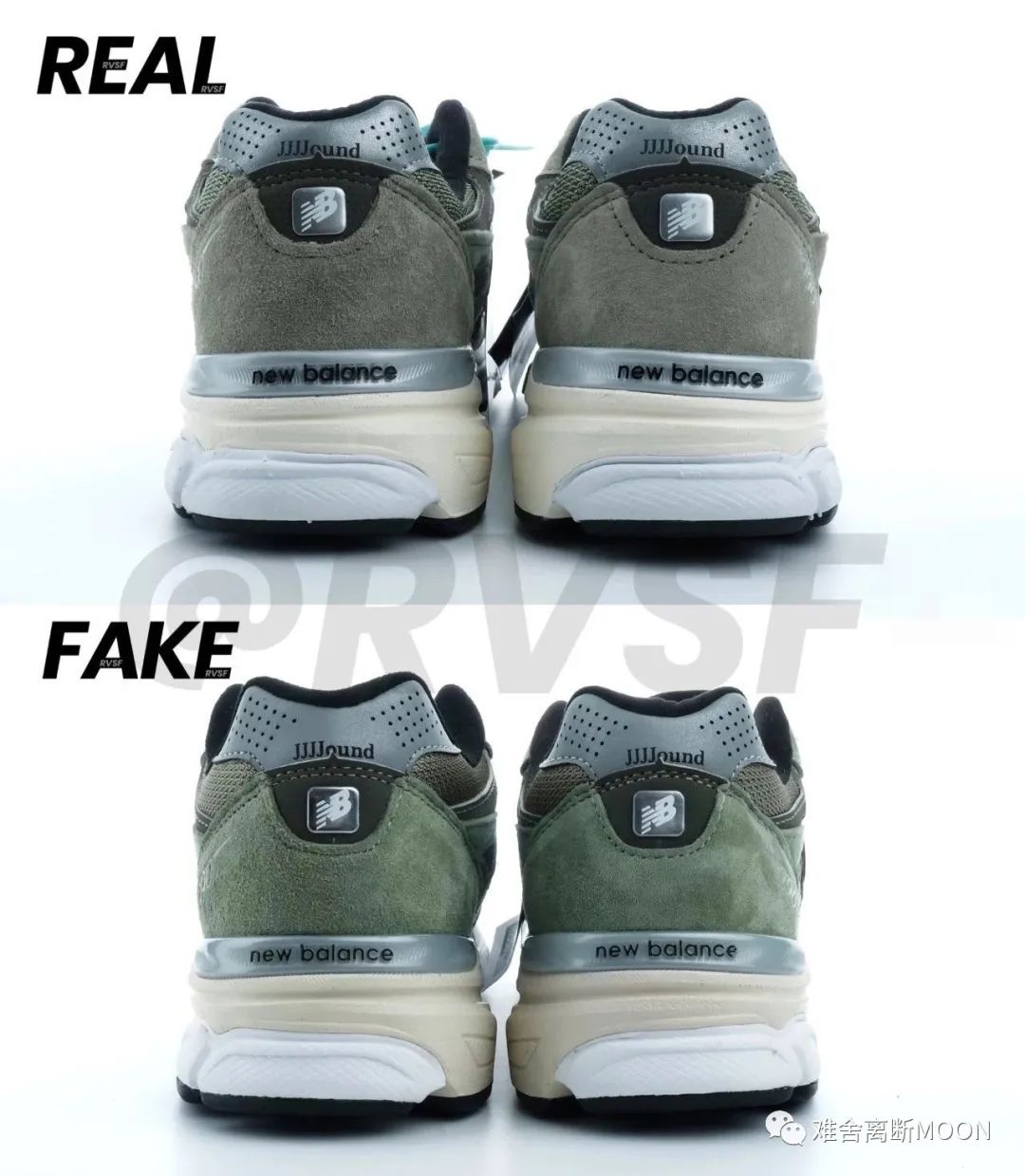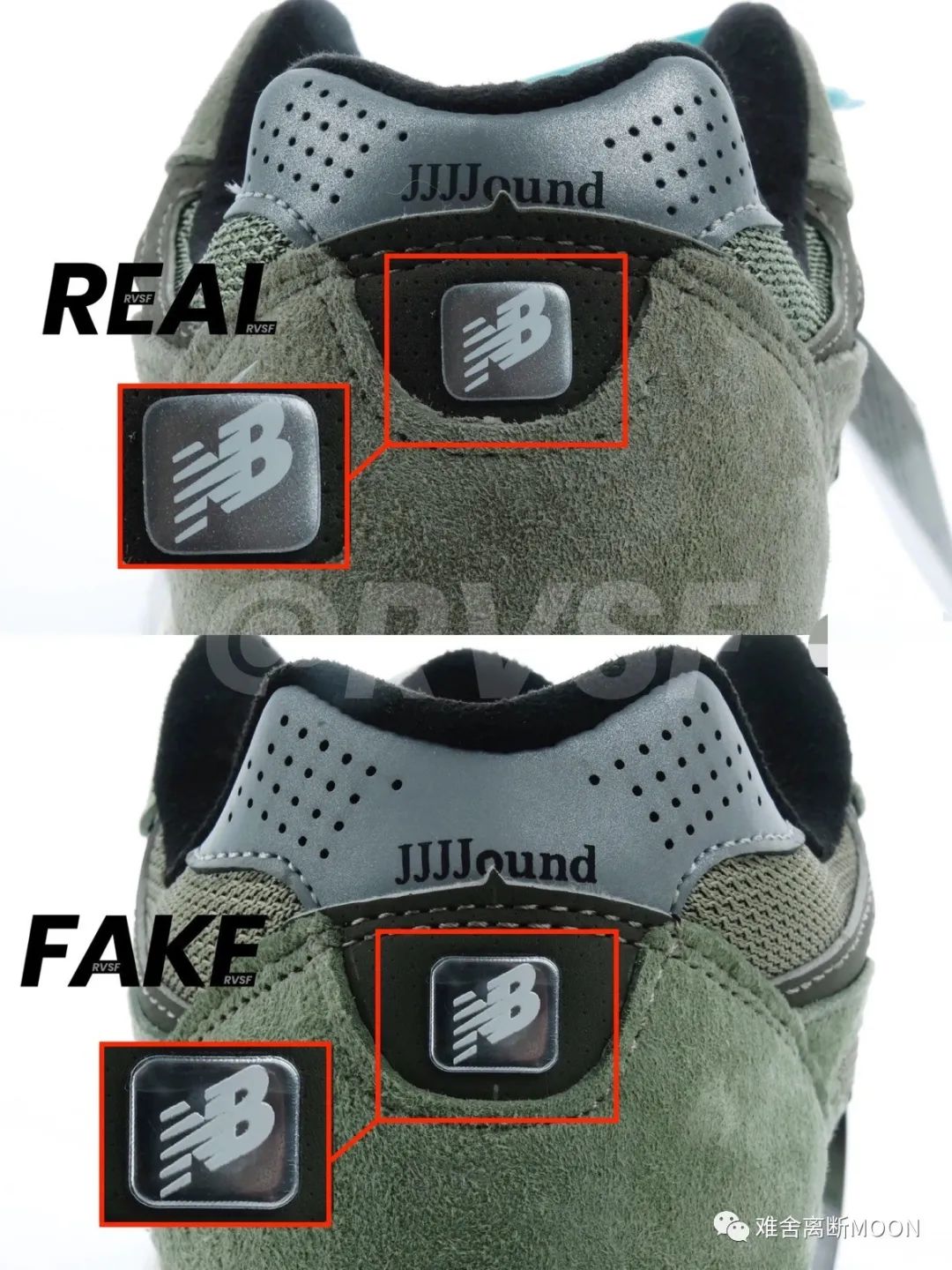 「990 V3基础鉴定点之六:REAL的后跟LOGO小方块是磨砂质感的,而本期对比的FAKE为镜面质感,存在明显差异」