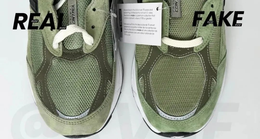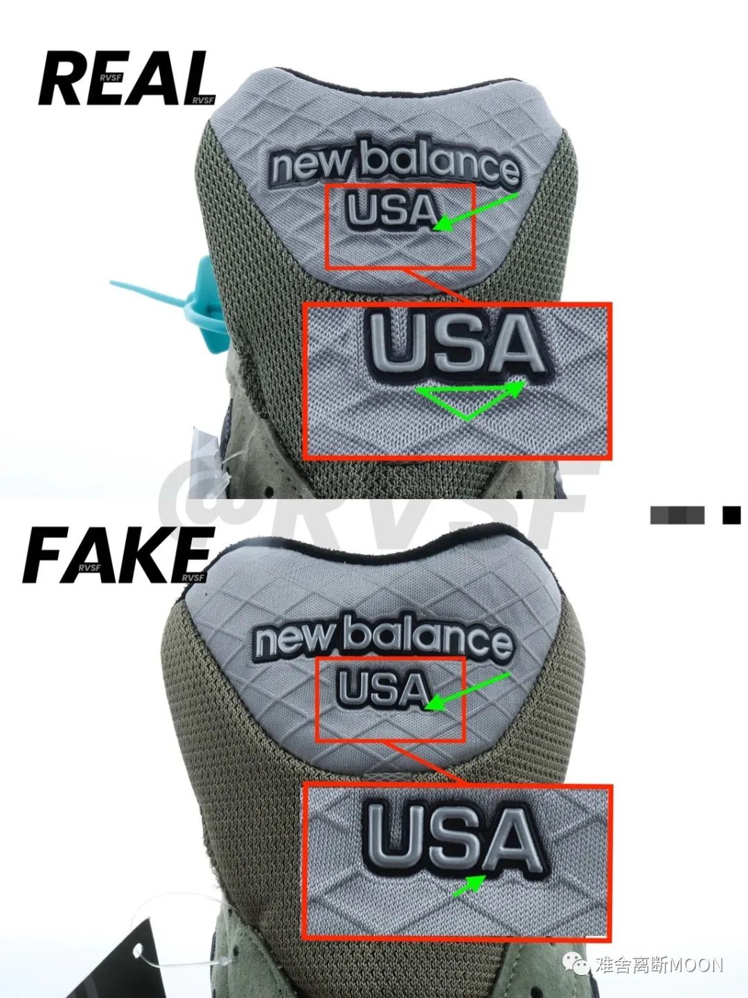 「990 V3基础鉴定点之二:这个点也是仅适用于带有华夫格纹鞋舌设计的990 V3,如图所示,NB的LOGO是存在对位讲究的,例,以“USA”的“U”的左侧(包括最外圈黑边)为参考做辅助线延伸上方,REAL的“U”左侧是和“W”的右下角(包括最外圈黑边)平齐,而本期对比的FAKE的“U”左侧是和“W”的右上角平齐,存在明显差异」