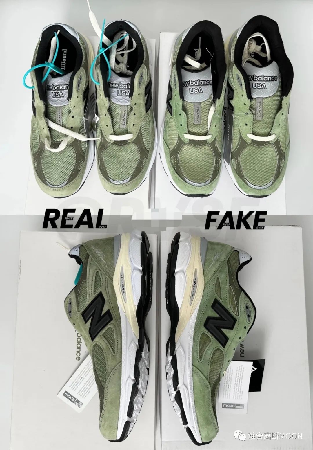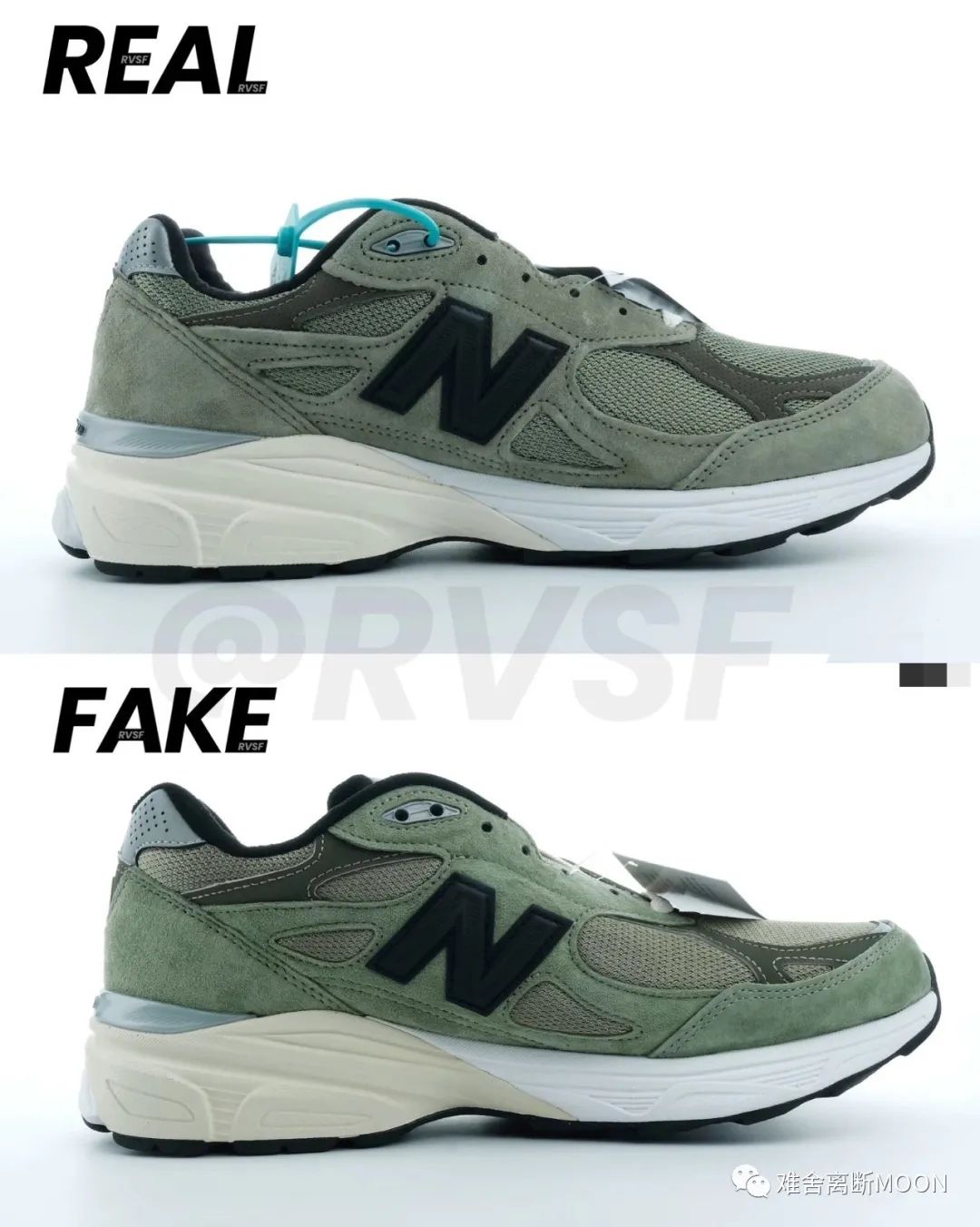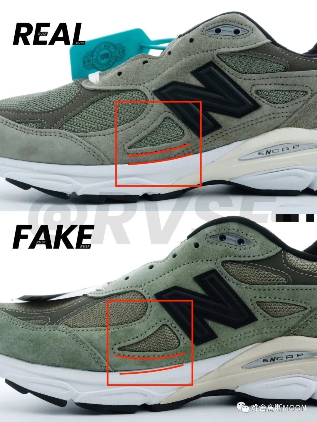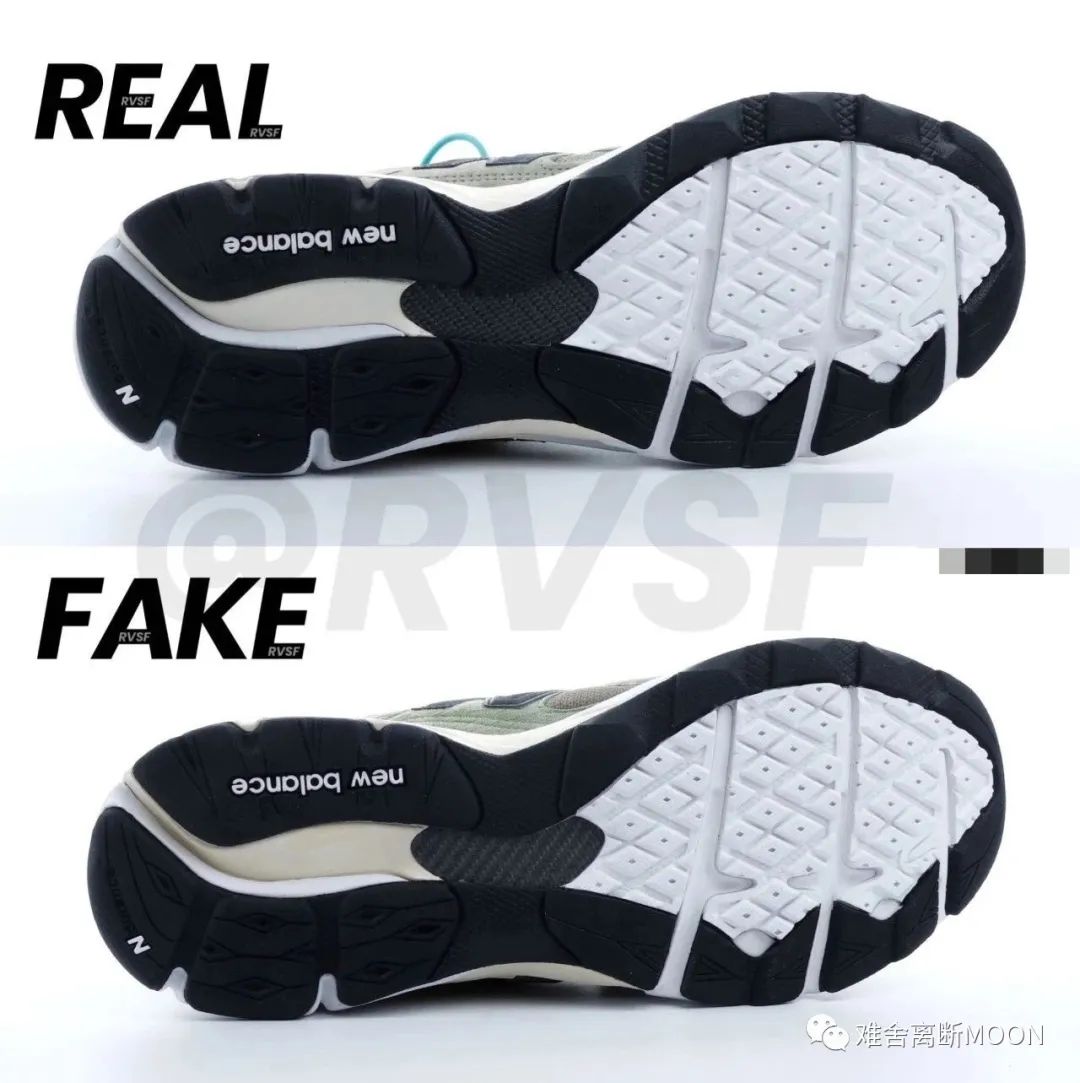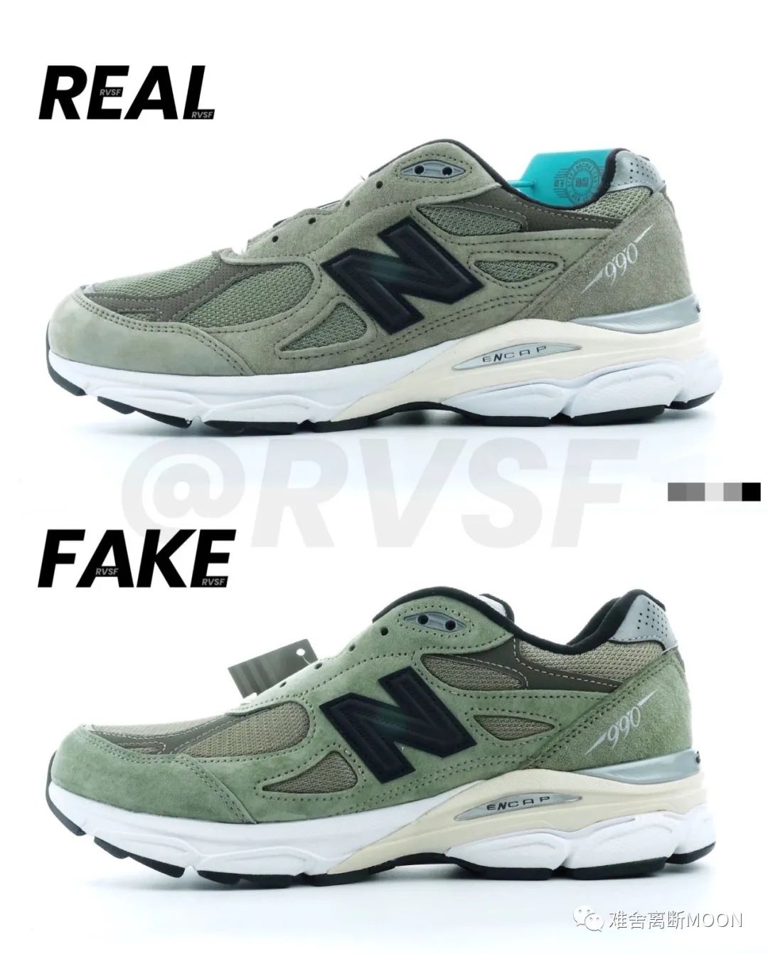 「990 V3基础鉴定点之三:990 V3鞋身裁片的设计是有很大讲究的,没错,这个鉴定点就是鞋身裁片的设计细节,如图所示,REAL这一位置裁片形状的三角形设计贴着大底的一侧,是和大底平行的设计,从而达到整体设计的美观和线条的流畅,而本期对比的FAKE则明显不与大底平行,存在明显差异」