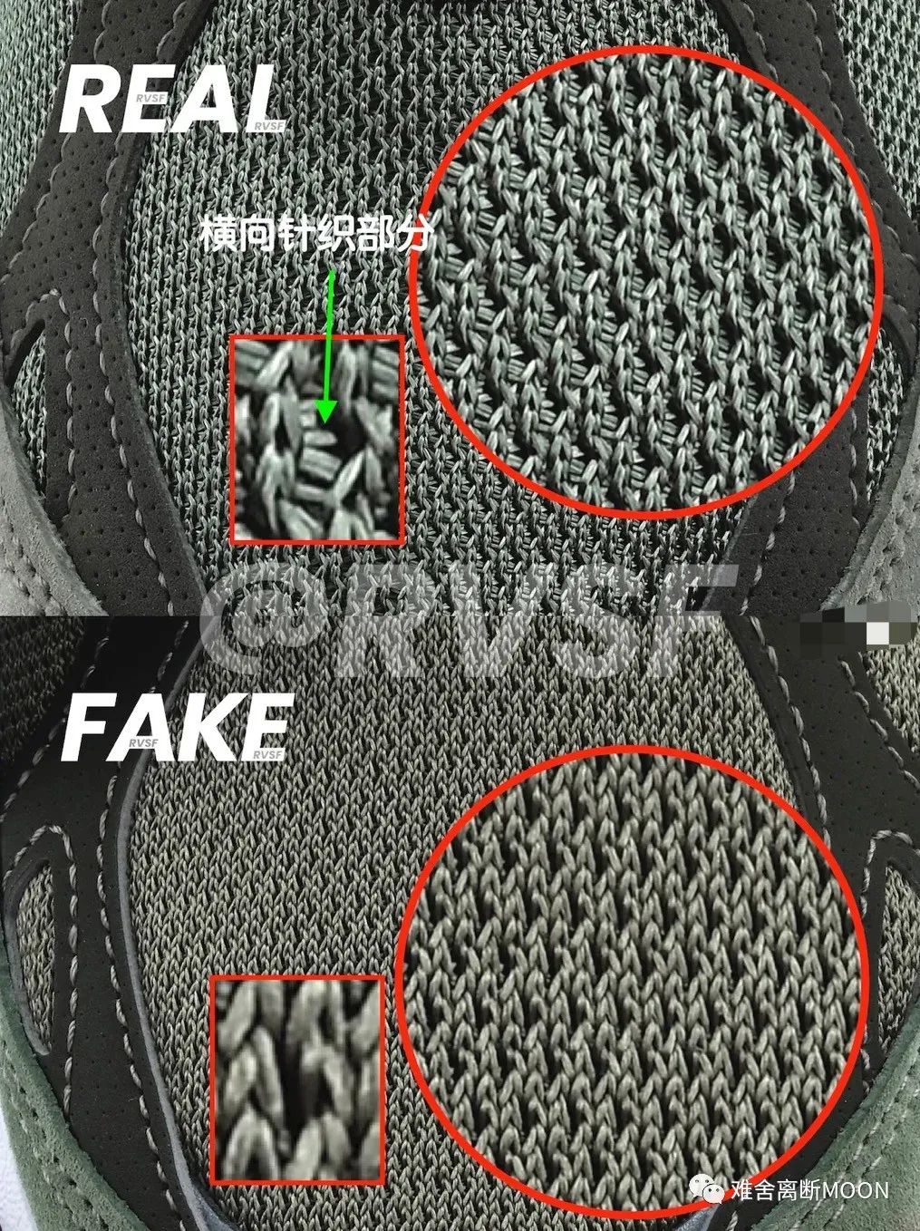 「990 V3基础鉴定点之五:网纱的纹理存在明显差异:REAL的网纱放大去看可以明显看出来存在两个方向的纹理,一个是在外侧竖向的针织纹理,另一个是内里横向的针织纹理,而本期对比的FAKE无法看出来内里横向的针织纹理」