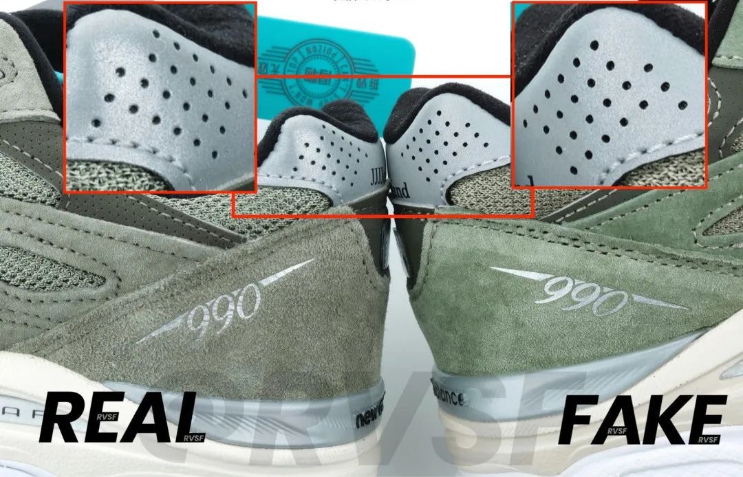 「990 V3基础鉴定点之七:后跟LOGO的位置,注意,这里是需要以冲孔来参考位置,而不是下方的美人尖为参考位置,REAL的LOGO位置是在第二排冲孔附近的位置,而FAKE则是在第一排冲孔附近位置,存在明显差异」