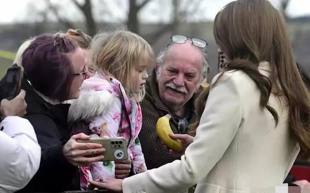 她停了下来,返回,并且与小女孩一路攀谈,小女孩要送凯特王妃塑料香蕉,王妃当时未接受,女孩扔地上,凯特王妃微笑弯腰捡起,并且接受任性小女孩的一个玩具香蕉。令女孩母亲连呼:意想不到……