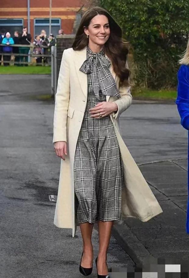 这家机构的第一任赞助人是她的婆婆戴娜王妃,当时她也曾穿着格子的套装前往,这次凯特三度重穿 Chris科瑞象牙色定制长外套,内搭一件2020年入手的Zara格纹连衣裙,这款连衣裙,与戴安娜曾经访问这一所慈善机构时穿的格子纹有相近之处,她又一次致敬了她的婆婆。