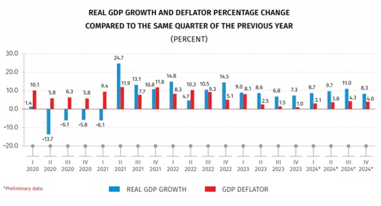 其中2024 年第四季度格鲁吉亚实际 GDP 同比增长 8.3%,达到 253100 亿格鲁吉亚拉里(约合 90.1 亿美元)。