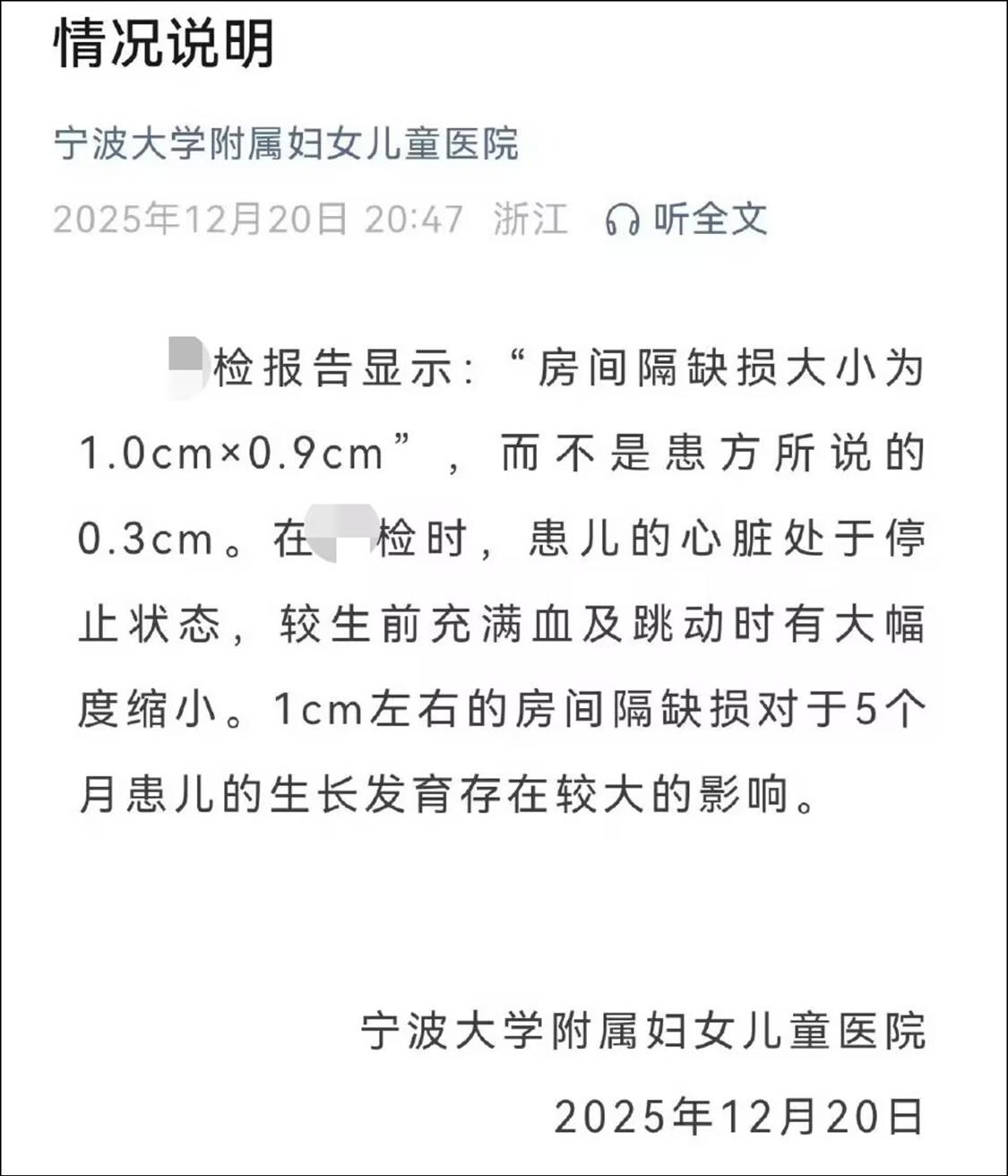 后来,医院也也发了情况说明,说小洛熙房间隔缺损是1.0cm×0.9cm,不是家属说的0.3cm,医院还强调这么大的缺损对孩子影响很大。