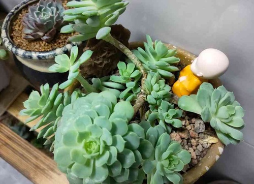 在居家场景中,这样的拼盆特别好看。想象一下,在客厅的茶几上放着这样一个充满创意的多肉拼盆,闲暇的时候看着它,心情都会变好。在办公室里也很合适,工作累了的时候看一眼,能让人放松不少。不过在办公室种植的时候也要注意一些问题。有个在北京办公室工作的网友说,他们办公室很多人喜欢养多肉,但是因为办公室空调温度有时候比较低,而且光照也不是很充足,有些多肉就长得不好。所以在办公室种植多肉的时候,要根据实际情况调整位置,尽量让多肉能接受到合适的光照,温度低的时候可以给它们套个小袋子保暖。