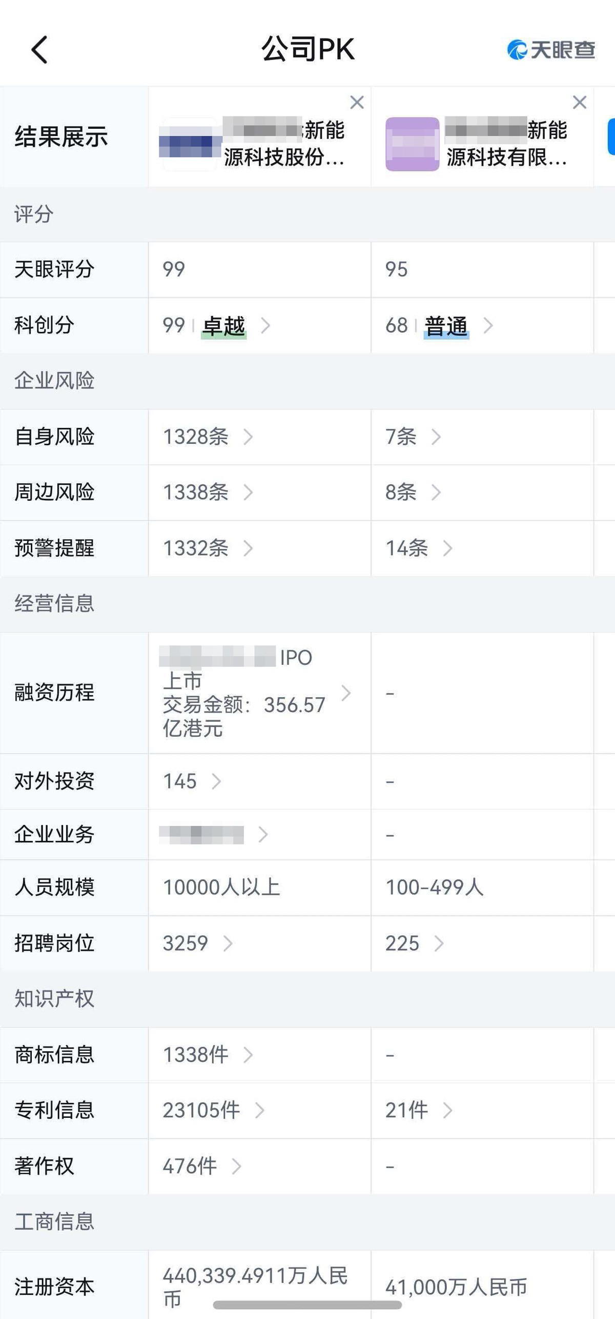 我直接把表妹提到的两家公司放进“公司PK”里,界面立刻并列展示出天眼评分、企业风险、知识产权等核心数据。这么一对比,怎么选一目了然。