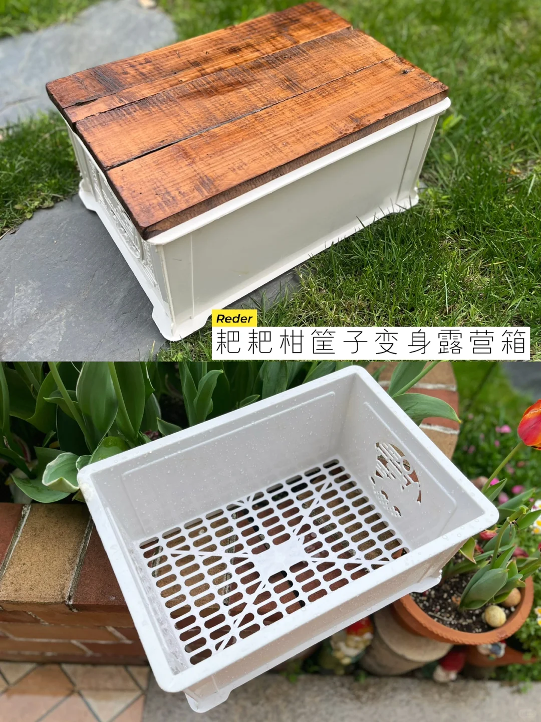 方法非常的简单,只需要提前准备一个水果筐,接着再用废弃的木板做一个水果筐的盖子,一个简简单单的户外露营箱就做好了,出门时携带方便。