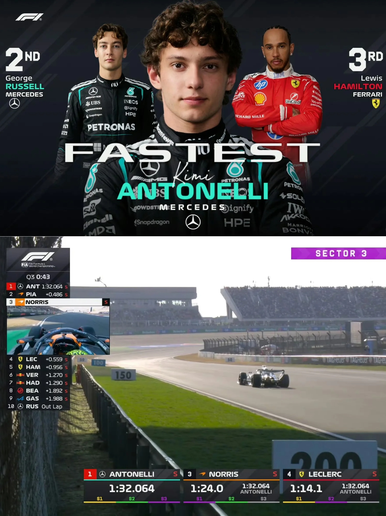 19岁的安东内利居然拿杆位了,刷新F1最年轻杆位记录!!梅奔这赛季也太猛了吧,一二带回,拉塞尔P2。虽然冲刺赛拉塞尔夺冠了,但小安那个10秒罚时真的可惜(跟哈贾尔碰撞),不然成绩还能更好。