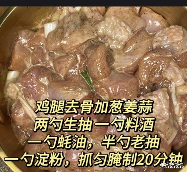 这道菜的魅力,首先源于其选材的巧思与处理的精细。主角是鲜嫩多汁的鸡腿肉,相比于鸡胸肉,鸡腿肉的脂肪含量更适中,口感更为软嫩,是成就“外酥里嫩”这一核心口感的关键。制作的第一步,便是将鸡腿去骨,切成大小均匀的丁状。随后,便是腌制环节,这是赋予鸡肉灵魂的第一步。将切好的鸡丁放入碗中,加入葱段、姜片和蒜末,这两勺生抽、一勺料酒、一勺蚝油、半勺老抽以及一勺淀粉。生抽提鲜,料酒去腥,蚝油增香,老抽上色,而淀粉则是锁住水分、保证肉质嫩滑的秘诀。将所有调料与鸡丁充分抓匀,静置腌制约20分钟,让每一块鸡肉都饱饱地吸满酱汁,为后续的烹饪做好准备。