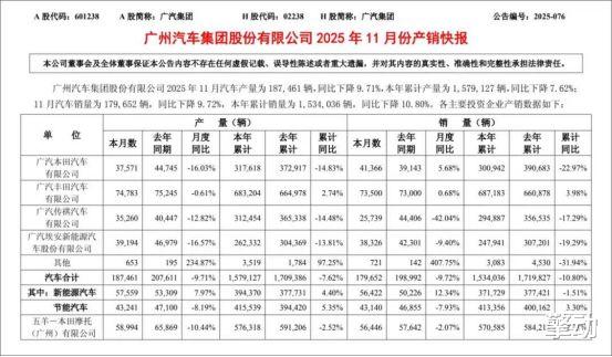 其实在2024年,广汽集团的经营压力已经很大。2023年,广汽集团还以250.5万辆的销量创下历史新高,实现连续三年正增长。到了2024年,年销量降至200万辆,同比下滑超20%。时间来到2025年,广汽集团1-11月累计销量为1534036辆,同比下滑了10.8%。