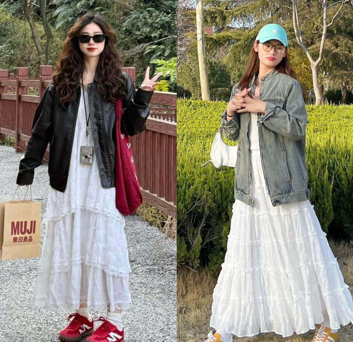 当然,像这种白色的半身裙搭配德训鞋时一定要避免臃肿感,裙摆可以稍微宽松一些,这样的裙子穿起来才不会感到紧绷和拘束,配上平底德训鞋反而很松弛。