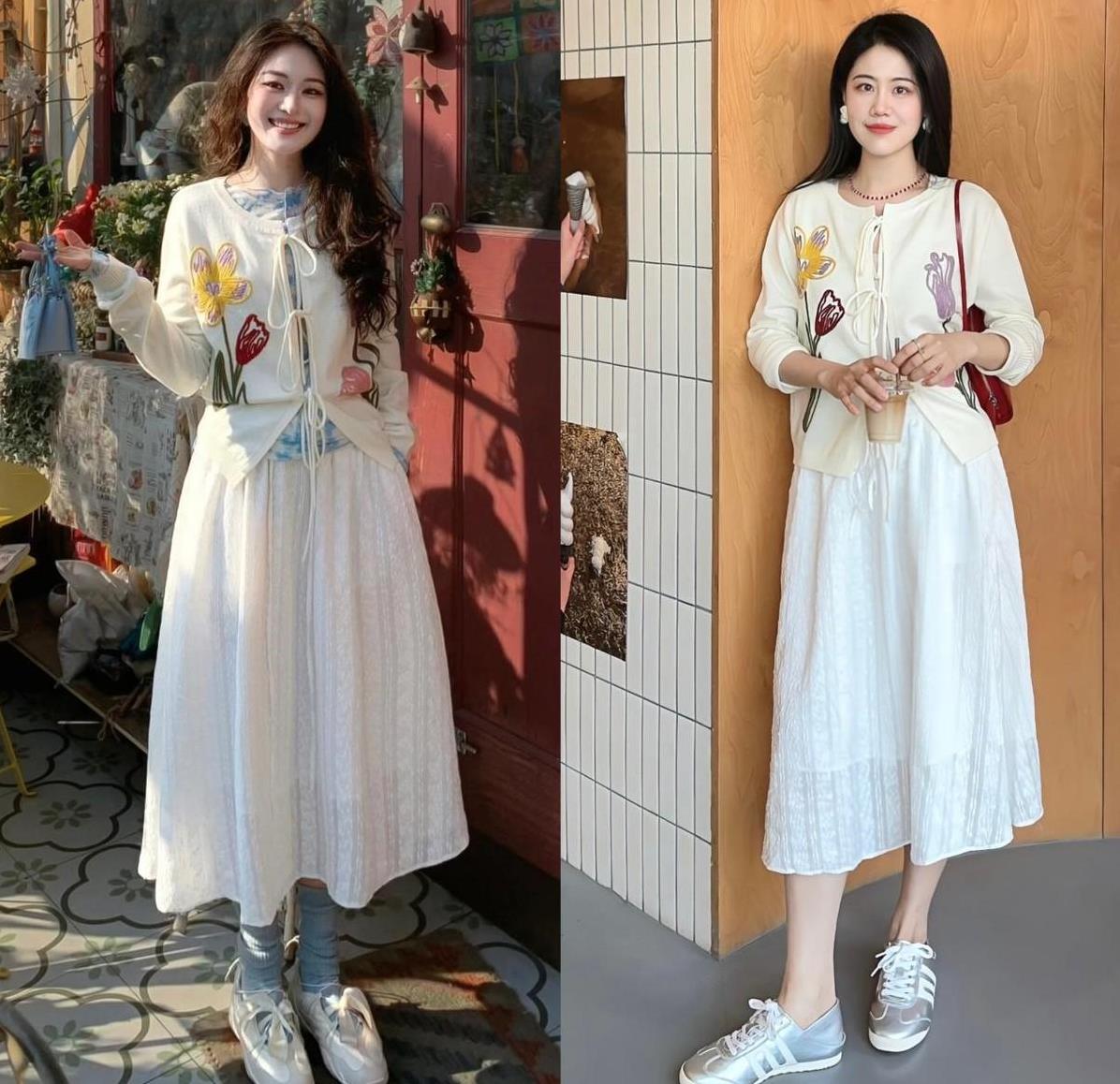 白色系搭配非常适合春夏,比如这种黄色的针织衫,配上白色的半身裙,就显得特别的清爽,再配上一双白色的德训鞋,也可以和裙子呼应起来呢。