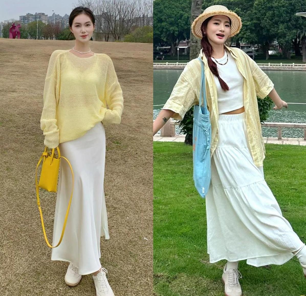 黄色和白色的配色也蛮合拍的,就像这种黄色衬衫,还有针织衫,穿在身上都能提亮我们的肤色,看上去明媚大方,搭配白色的半身裙又显得很简洁。