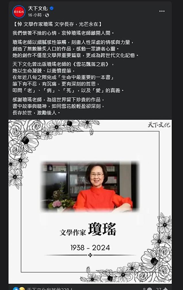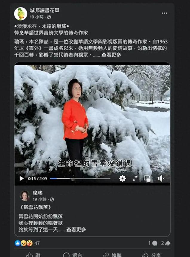 琼瑶,那个曾经用文字编出好多浪漫故事的超有名人物,告别了这个世界。按说这应该是整个文学界和影视界一起纪念她的时候,可谁能想到呢,平鑫涛的三个孩子啥都没说,他们管着的皇冠出版集团也没发任何悼念的文章。跟这不一样的是,城邦读书花园和天下文化那两大出版集团都发文章悼念了。