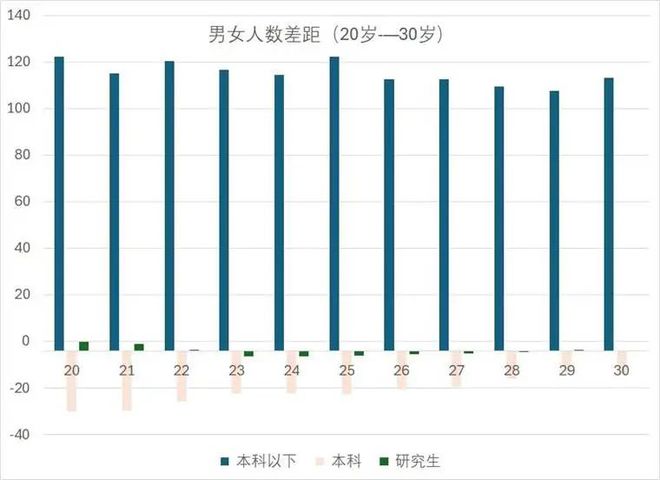 这意味着未来十年,正是这批小伙子们找媳妇的集中期,“僧多粥少”的局面相当严峻。雪上加霜的是“学历错配”。在20到30岁的黄金婚恋人群里,情况很“分裂”:没上过大学的,男多女少;可一旦上了本科甚至更高,立马变成女多男少,而且女的比男的多了差不多30%!