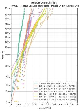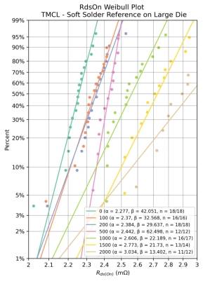 结论:如图7所示,高铅焊料在500至1000次循环之间平均导通电阻出现显著的变化;在1500次循环测量中观察到平均𝑅𝐷𝑆𝑜𝑛相对增加超过20%。可明显观察到器件电气性能的系统性退化。