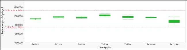 结论:经过连续12小时的点胶操作,图案面积始终保持在规格范围内。此外,整个过程中未出现点胶头堵塞的问题,确保了持续作业的稳定性和效率。