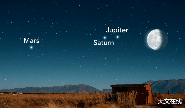 日出前,明亮的木星和火星位于天空的东方。木星在东边从地平线到头顶距离不到一半的地方,在今天早上的天空中,它比其他所有的星星都要亮。它在金牛座前面缓慢地向东移动,距离毕宿五的左下方约7°,是金牛座最亮的星星。