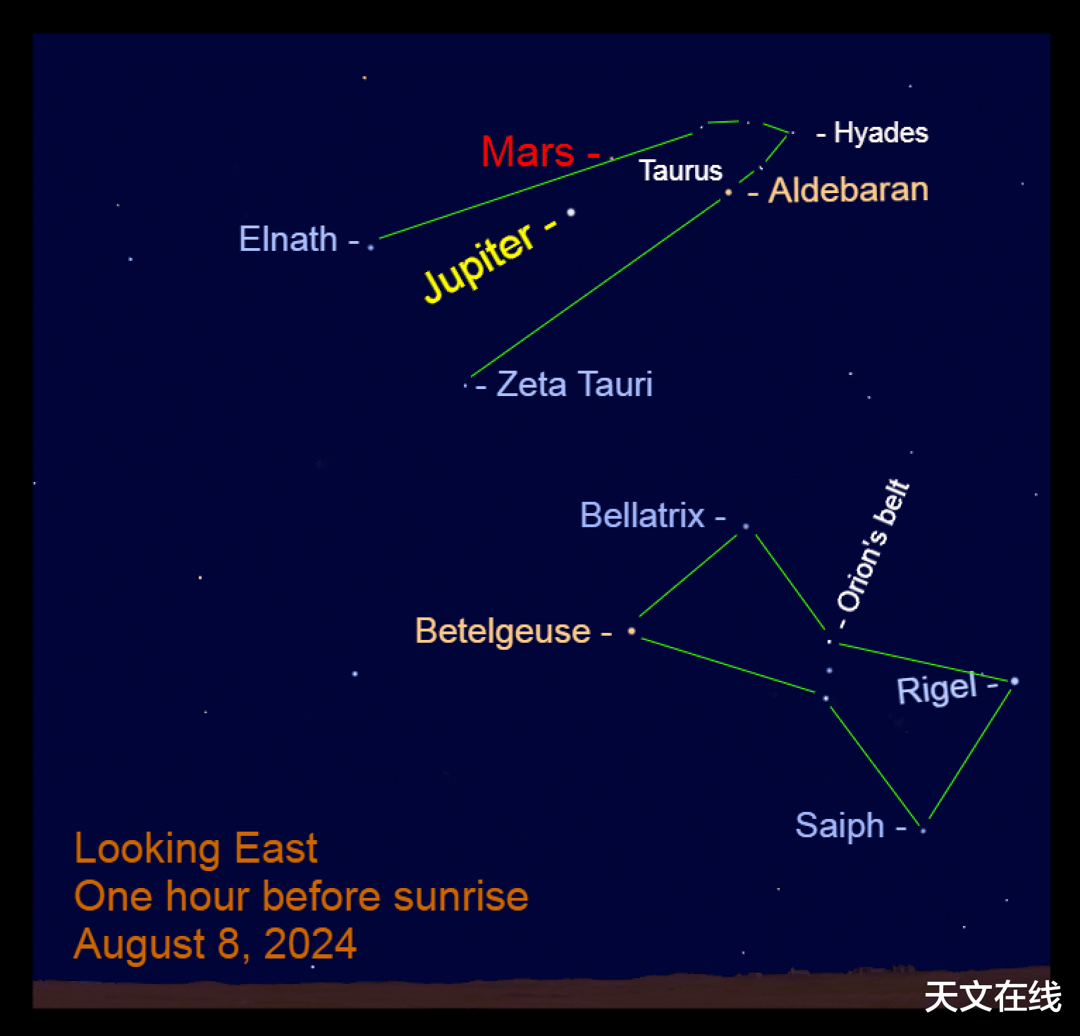 图片说明:2024年8月8日:日出前一小时,在天空的东边,木星和火星位于金牛座前方。