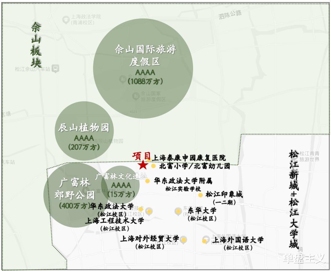 环绕旁侧是包含佘山国际旅游度假区、辰山植物园、广富林郊野公园、广富林文化公园近17平方公里的公园叠翠