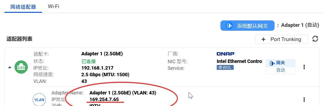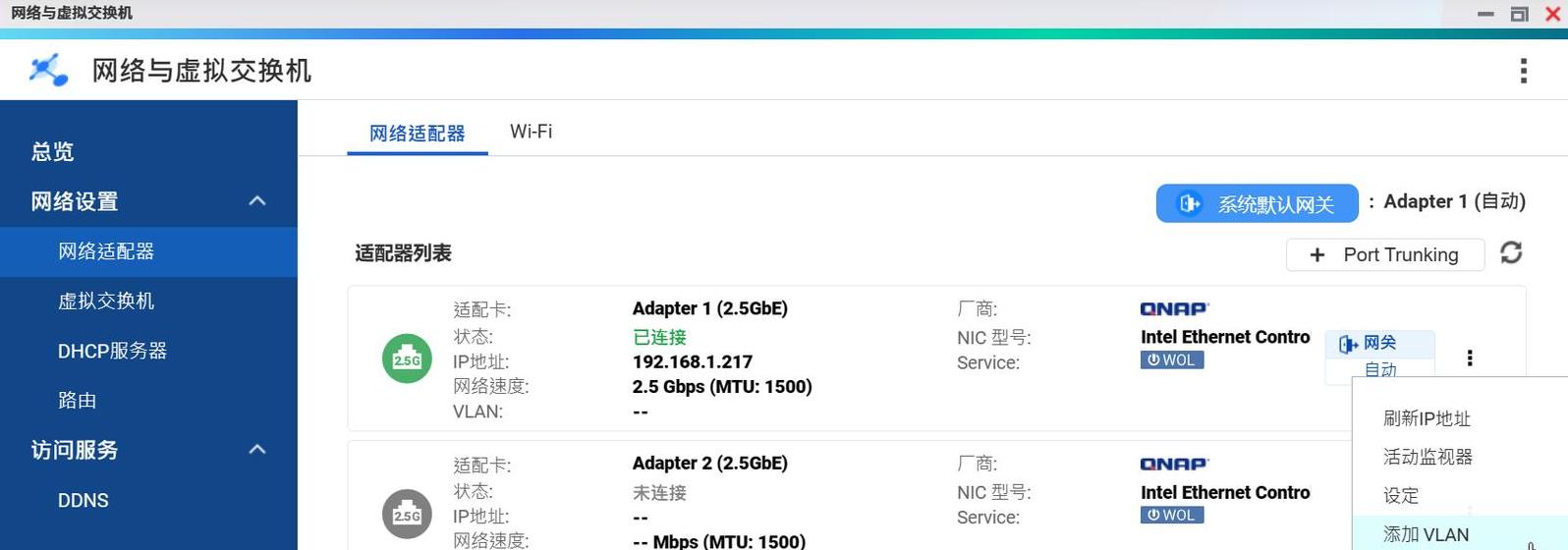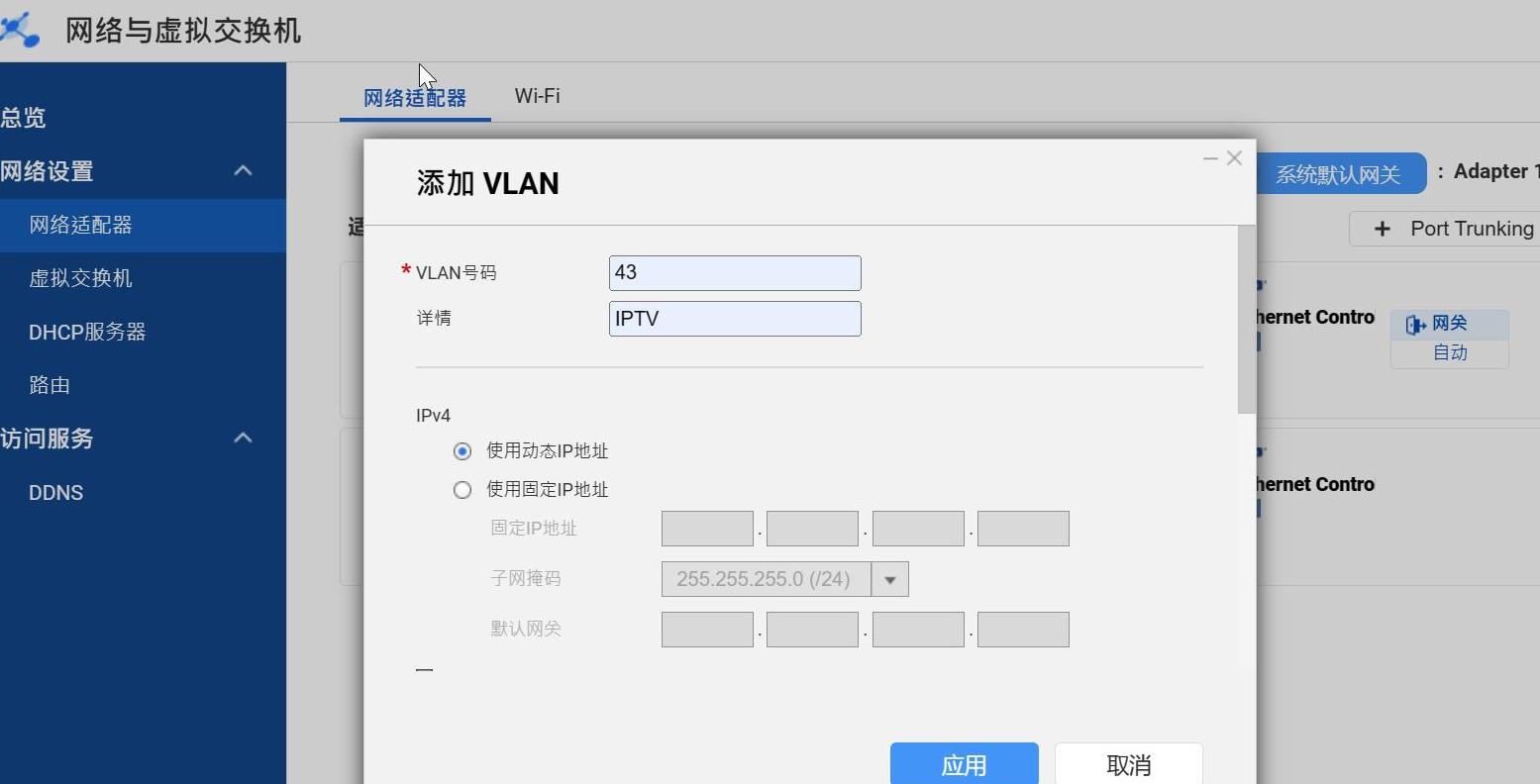 接下来在威联通NAS的设置里,打开网络和虚拟交换机,选当前连线的网口,点击右侧的省略号,添加VLAN,把刚才记下的数字43填进去,应用后搞定!
