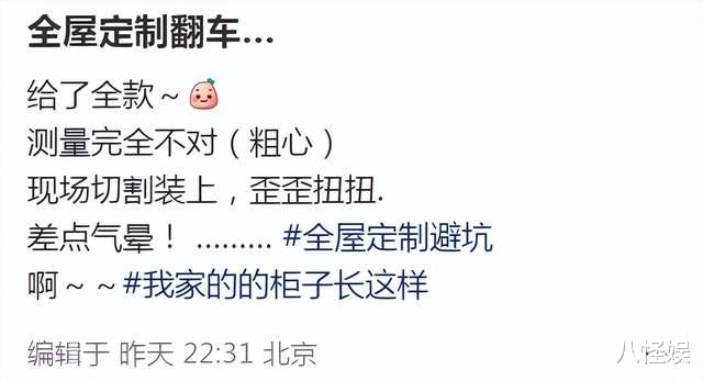 廖语辰还晒出了装修成果照,一眼看去强迫症看了表示真的很难受,只见柜门上钉眼十分明显,而且,柜门压不住柜体,外露十分难看。别说是廖语辰,对于任何一个人来说看到耗尽心力装修的房子成这样都会难以接受吧。