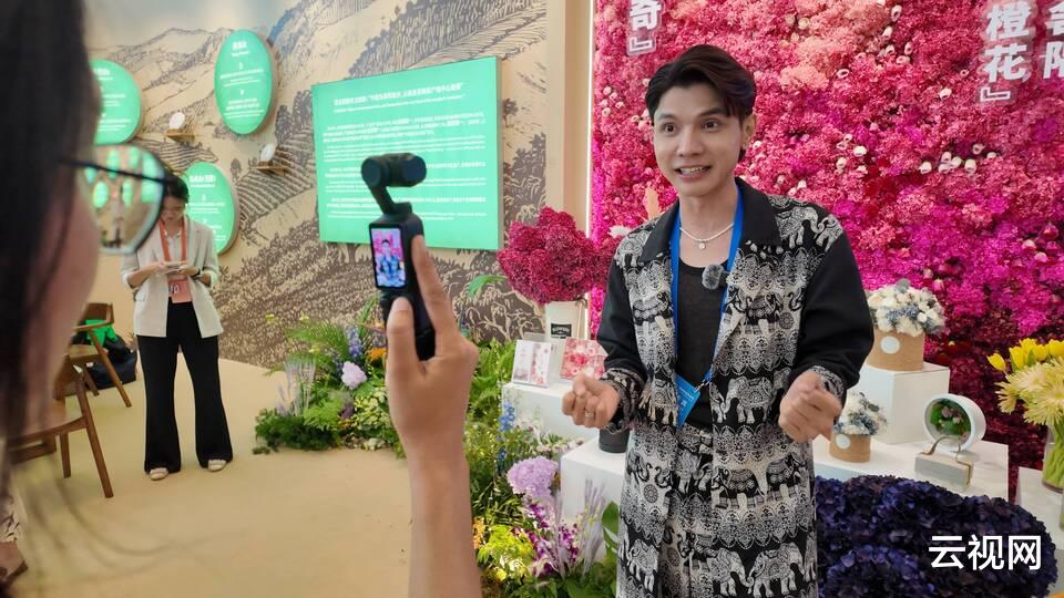 在鲜花簇拥的展区前,拥有204万粉丝的老挝国民网红、时尚达人坎披吉·维索(KHAMPHICHIT VISO)拿着一束鲜艳的云南玫瑰,正与定居云南的泰国博主陈慕筠(JARUWAN UDOMSAB)亲切交谈。作为专业的舞蹈教师和模特,维索对美有着敏锐的感知,他不断调整花束的角度,用手机捕捉花朵与笑容交相辉映的瞬间。“云南的花颜色太动人了,”他感叹道,“它们自带一种不需要滤镜的鲜活。”陈慕筠在自己账号的视频中笑着介绍:“这里不是花市,是云南人的浪漫仓库!”