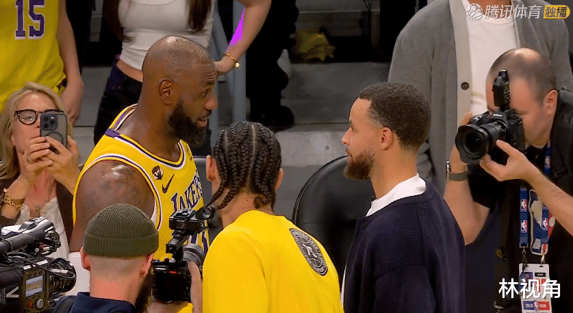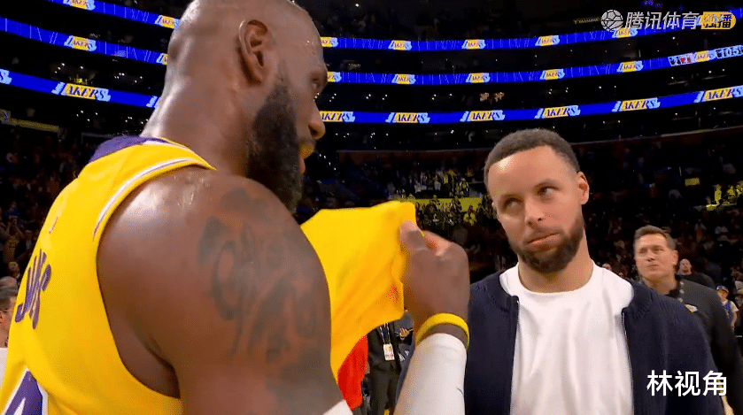 比赛结束,两队球员在场上互相拥抱致意,显得很友好,库里从替补席起身,走入场内,找到老詹,两人一通热聊。