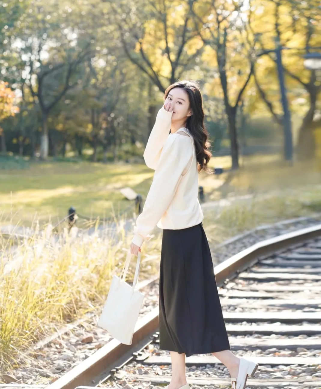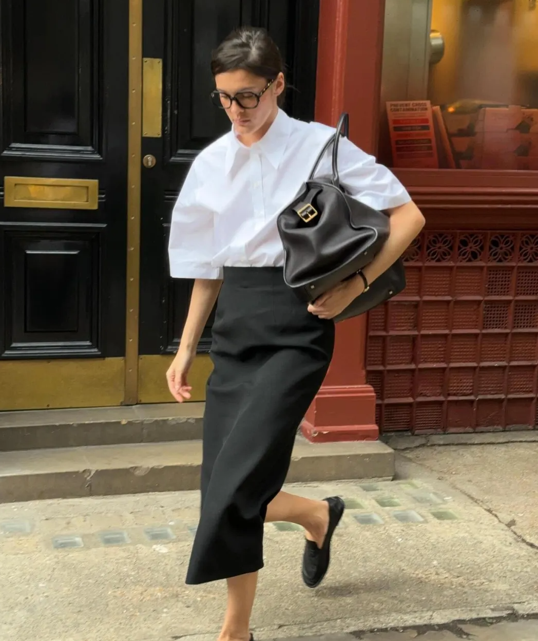 老钱风格怎么穿,不需要大logo,也不需要花里胡哨,一件简单的白衬衣搭配黑色长筒半身裙,再搭配一双黑色乐福鞋,想要营造一种松弛的氛围感,配上这种大大的挎包再适合不过了。