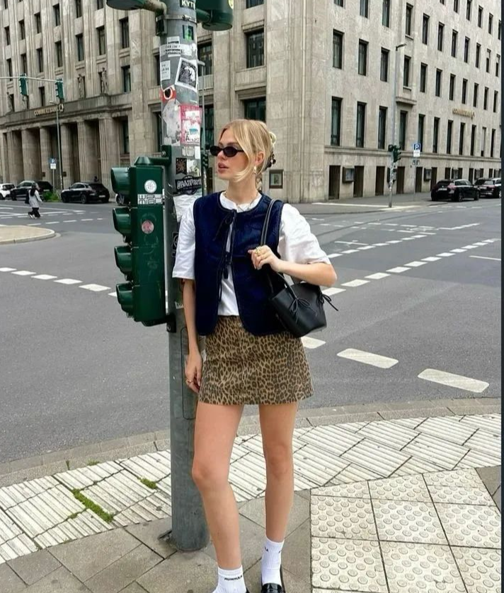 乐福鞋有着帅气的一面,又不失女人味,正好跟半裙在一起,娘man风格,很是好看。尤其是这种豹纹的半身裙,上衣选择T恤搭配牛仔马甲,超级酷,而且这种风格时髦减龄也不容易撞衫。