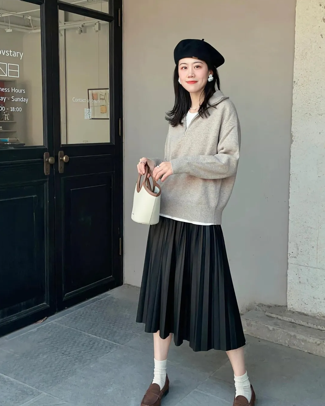 很多姐妹觉得卫衣穿不出气质,我们可以选择这种羊绒或者羊毛材质的卫衣,搭配百褶裙,优雅知性,尤其是贝雷帽,点睛之笔贝雷帽,还有乐福鞋配长筒袜,让简单的衣服变得精致起来。