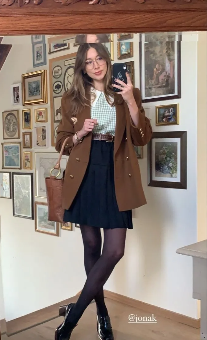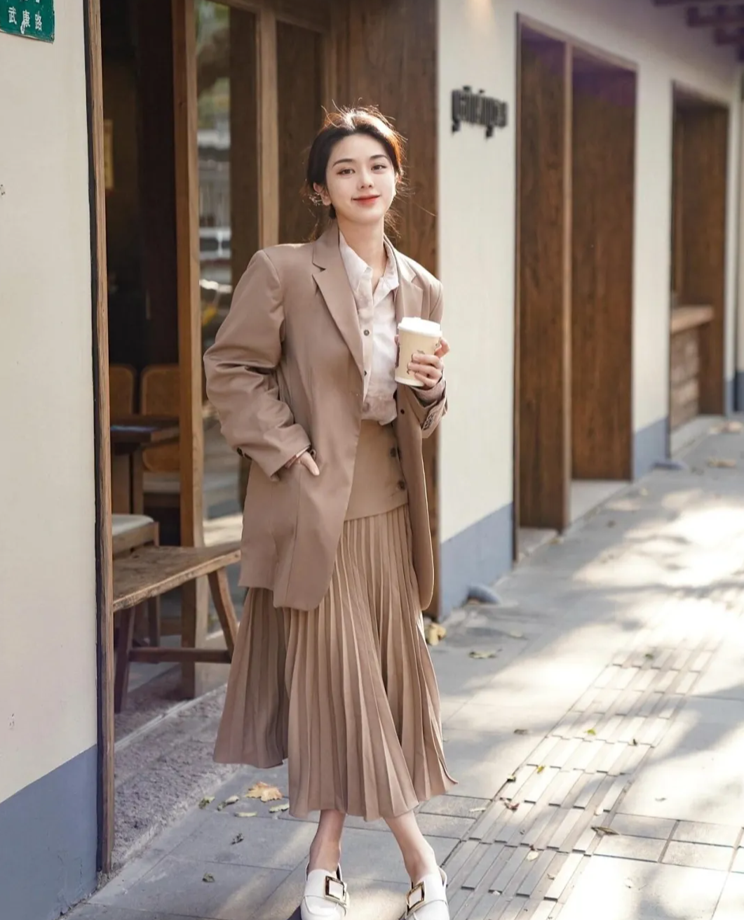秋天是咖色穿搭的季节,咖色西装搭配咖色百褶裙,利用白色衬衣作为提亮色,搭配白色乐福鞋,简简单单的配色,时髦耐看。