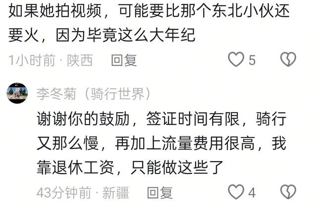 不过李东菊也回复了网友,她说自己不是不想做,是因为签证时间有限,骑行又很慢,她没有那么多精力和时间拍视频。