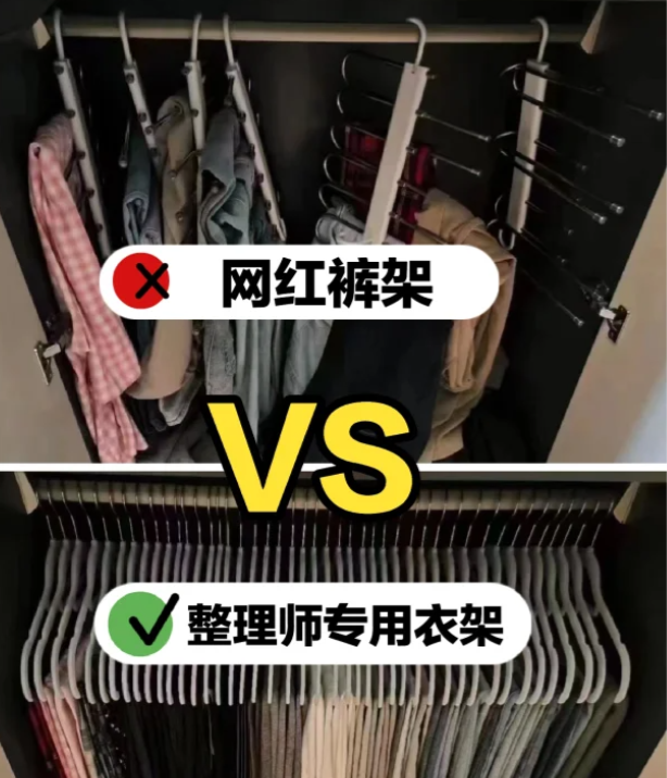 因为魔术裤架的承重能力是比较差的,当你在上面放上裤子之后,慢慢就会脱落了,而且每次你拿取裤子的时候,还需要你将所有的裤子都拿下来才可以。与其你花钱去买这种鸡肋的裤架,我们还不如将其全部都悬挂在衣架上面比较好。