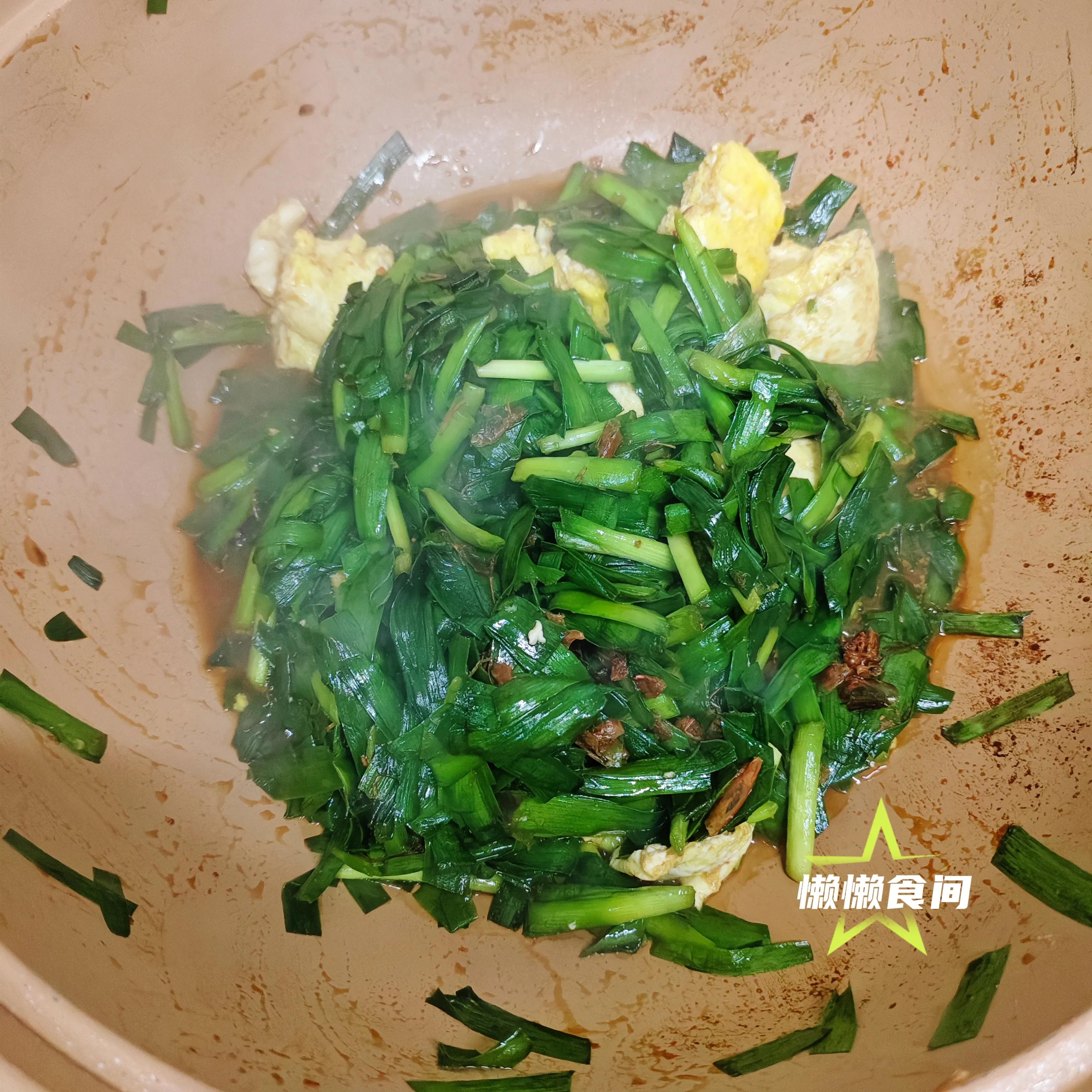 4、韭菜炒软加入味极鲜、鸡蛋,继续翻炒,翻炒入味,就完成啦!(虾酱咸味已经足够了,不需要再加盐了,只需要一点点的味极鲜提味就好。)