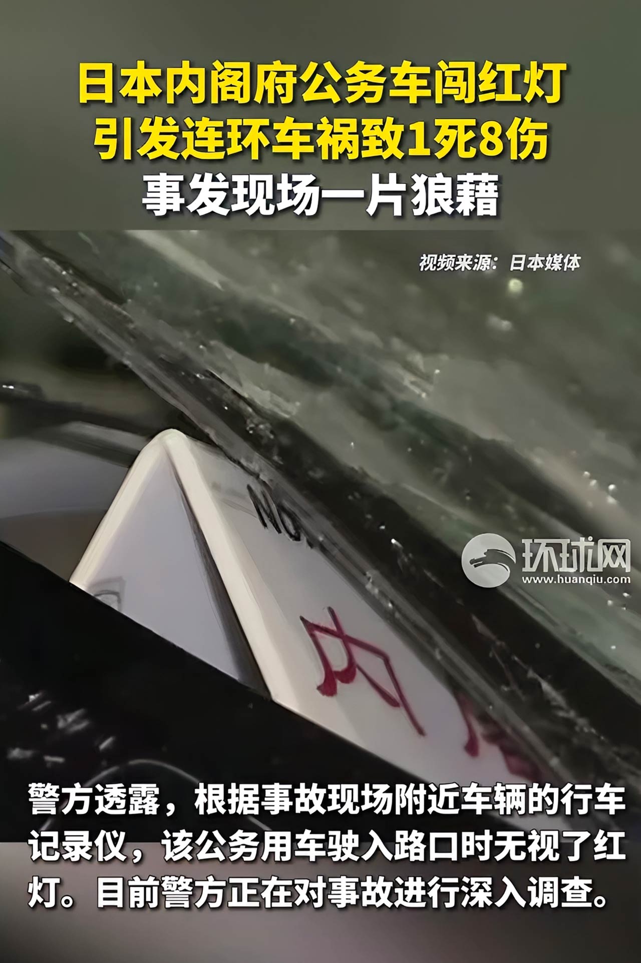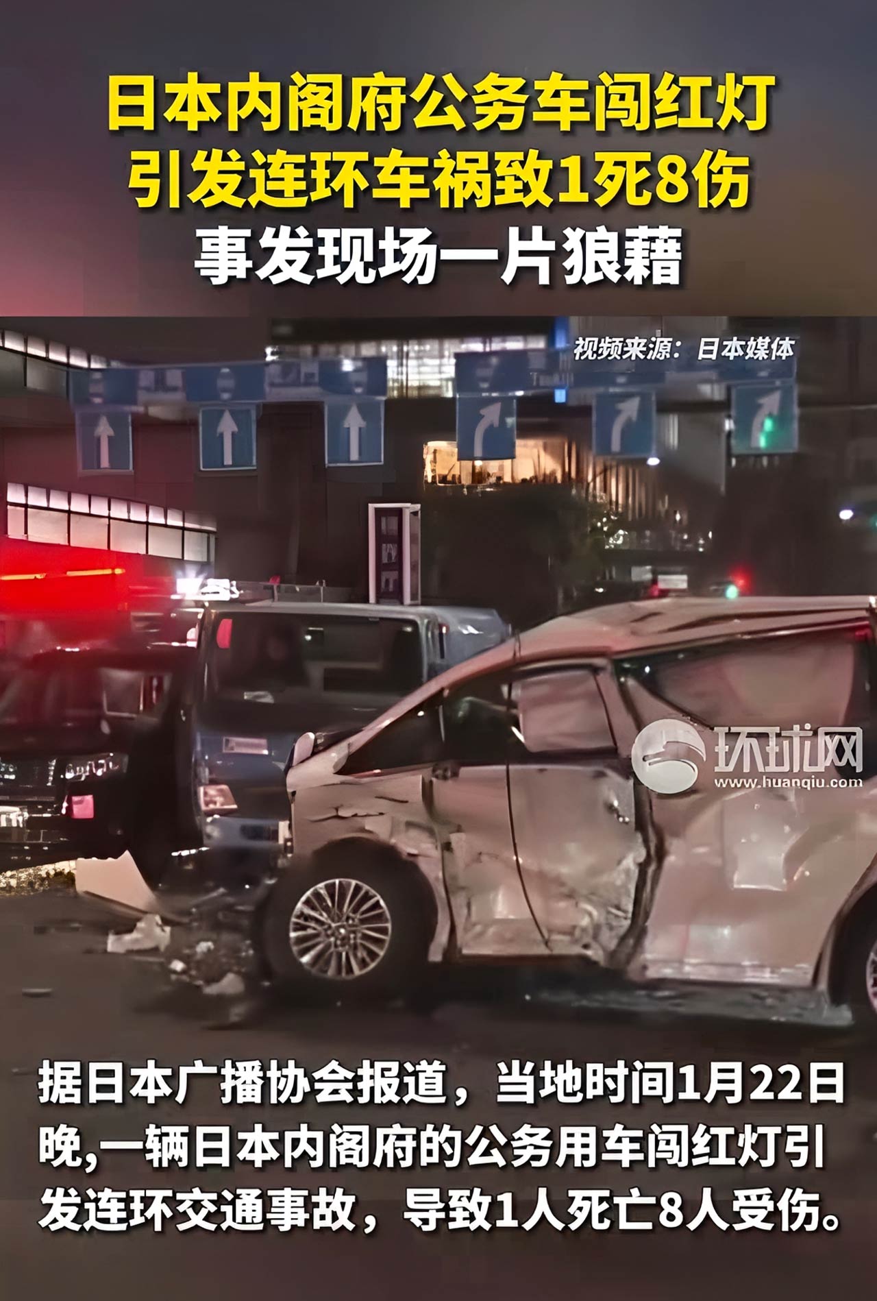 2026年1月22日晚6时30分许,日本东京都港区赤坂一处十字路口发生严重交通事故,一辆隶属内阁府的公务用车在疑似闯红灯的情况下驶入路口,与多辆正常行驶的车辆发生连续碰撞,最终导致6车连环相撞,造成1人死亡、8人受伤。