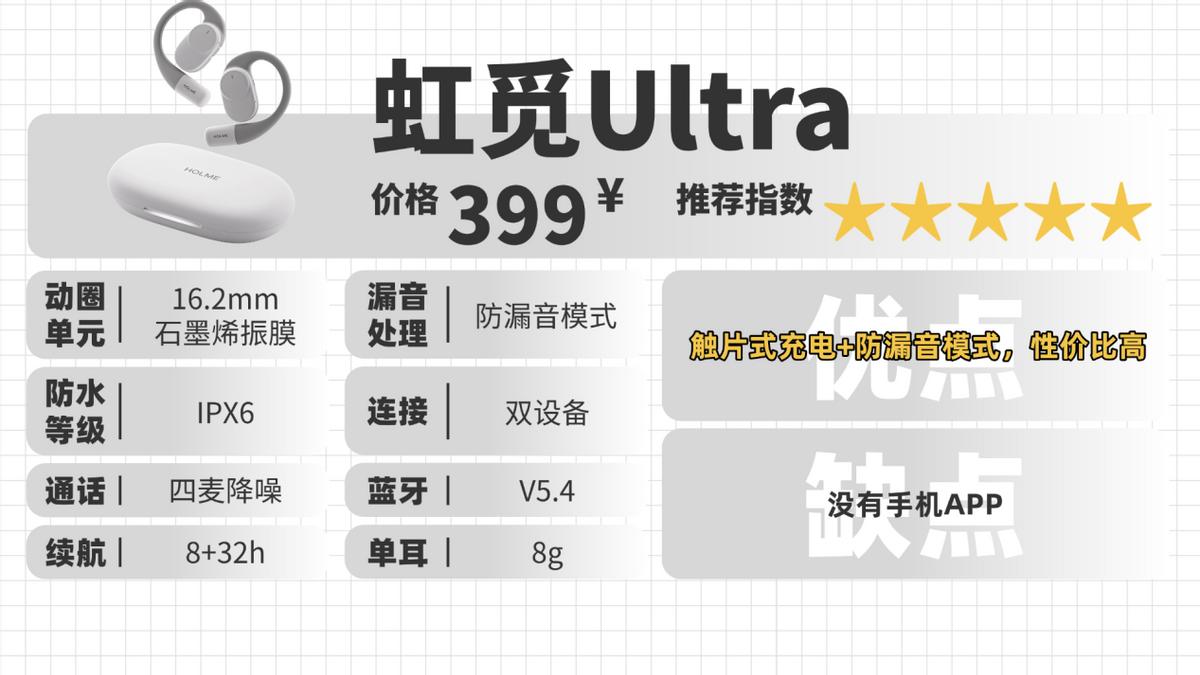 虹觅Ultra,这款自研的防漏音模式,能大幅降低开放式耳机常见的漏音问题,结合IPX6的防水等级,很适合在户外运动使用,耳挂采用流线型设计,不仅佩戴舒适,而且跑跳都很稳,动圈振膜是石墨烯材质的,石墨烯振膜的形变能力很强,能为声音提供更多的驱动力,不仅音量更大,同时音质也更加饱满。而且这款耳机采用的是触片式充电,不仅接触稳定,充电也更快;是一款在各方面都没有什么短板的开放式耳机。