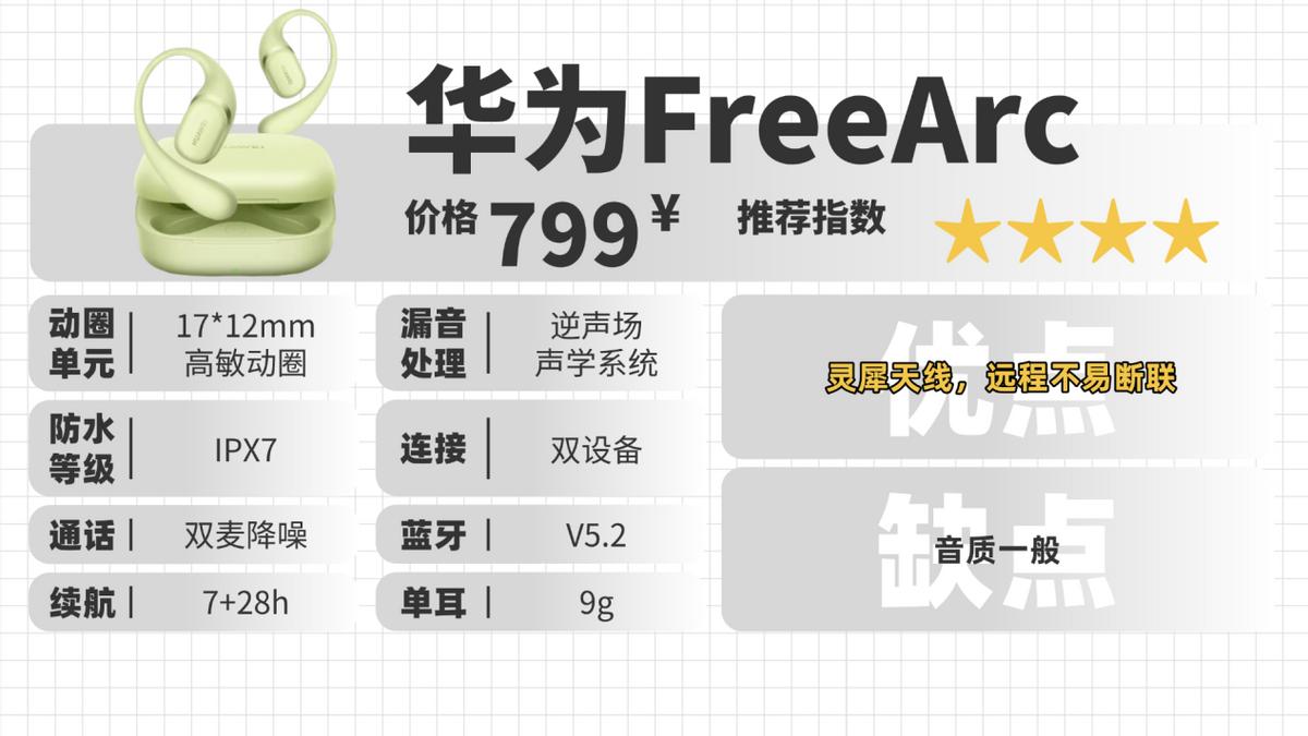 华为这款佩戴很稳固,能贴合耳部,运动时不易晃动。采用的是逆声场系统,漏音控制得不错,功能上搭载了运动播报这些华为自研技术,而且防水等级为IPX7,根本不用担心耳机的防水问题。在音质上仅支持两种基础编码协议,音质表现与低价位耳机拉不开明显差距,app自带的音效也只有默认EQ和运动两种调音。可惜就是续航偏短。