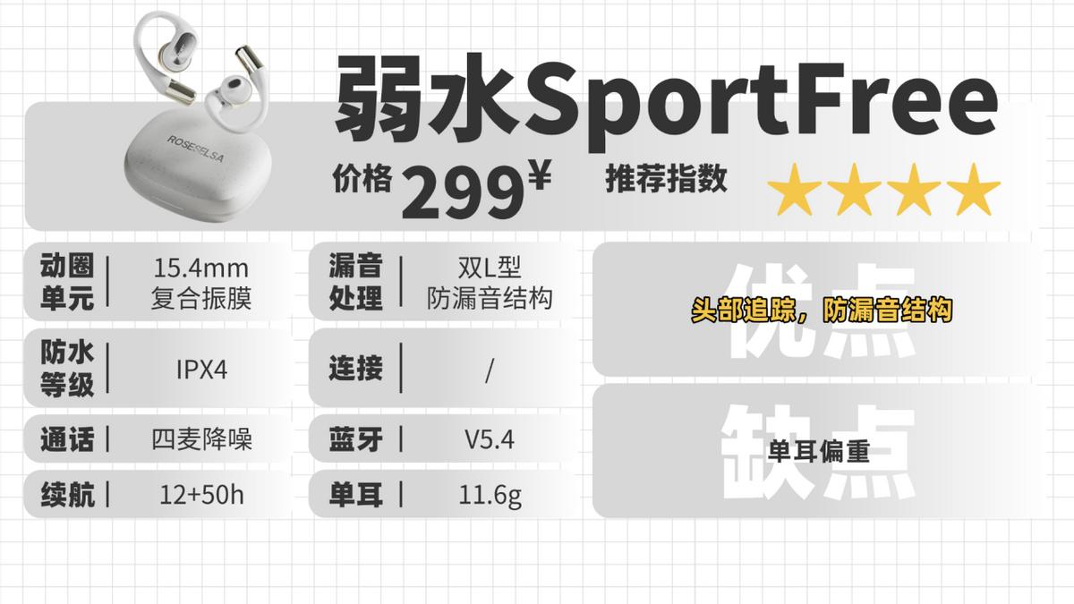 弱水这款在佩戴上,基础佩戴稳固性较好,但贴合度一般,而且单耳较重,长时间使用易产生轻微压迫感。音质方面,人声还原较自然,但下潜深度有限,整体动态表现偏平缓。但这款支持头部追踪音频,听感沉浸感很强,续航上拥有综合60个小时的续航,对续航、音质有要求,且预算不高的朋友可以入手这款。