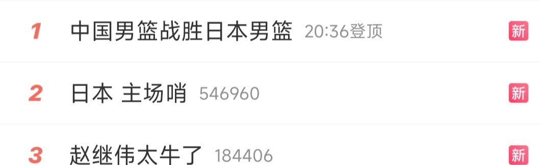 而有关于中国男篮战胜日本男篮的词条,登顶热搜,而且热搜榜前三全部都是关于这场比赛,前十也有一大半是中国男篮。这场比赛看的球迷荡气回肠,看的球迷解气,即便是裁判全力帮忙,也阻挡不了中国男篮赢球。世界篮联该好好想想了,吹罚如此丑陋,以后谁还跟你们玩。